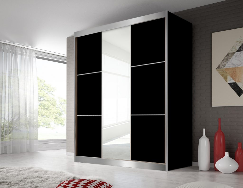 ארון הזזה שחור עם דלת מראה. מחיר המבצע הוא לרוחב 180 ס"מ. לאחר בחירת רוחב הארון אפשר לבחור לשנות גובה, עומק, חלוקה פנימית ולהוסיף תוספות.
